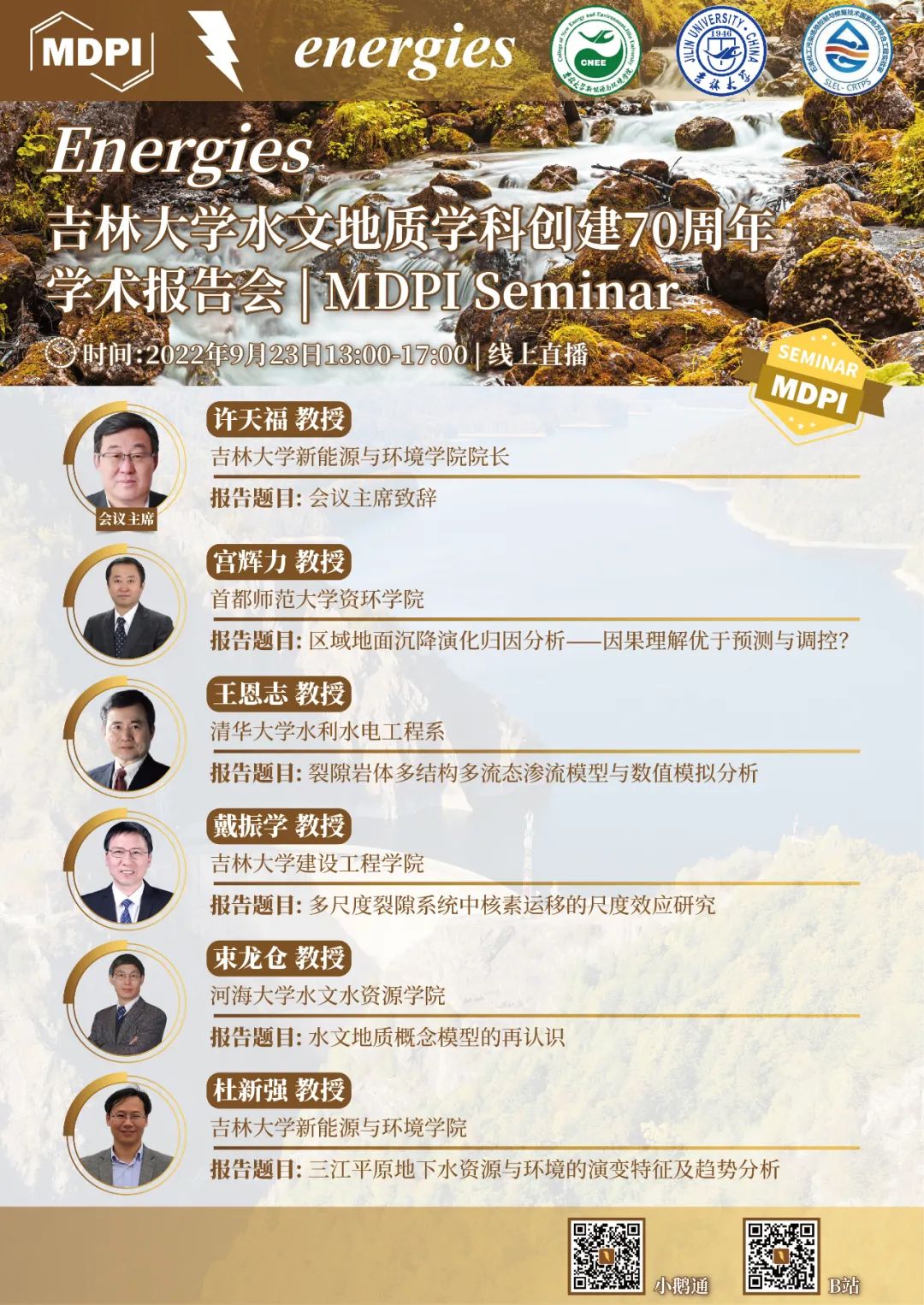 正值吉林大学水文地质学科 (原长春地质六合彩即时开奖 水工系) 创建70周年之际,Energies期刊携手六合彩开奖直播 特别邀请到六合彩即时开奖 院长许天福教授担任会议主席,并邀请首都师范大学宫辉力教授、清华大学王恩志教授、吉林大学戴振学教授、河海大学束龙仓教授,以及吉林大学杜新强教授,围绕水文地质学的相关研究进展为大家带来精彩的学术报告。