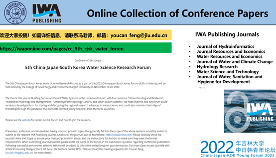 作为本次会议协办单位,国际水协会出版社(IWA Publishing)为会议创建会议文集,收录符合本次论坛主题的相关文稿,详情请见网站()。参会嘉宾或有意者可投至IWA publishing旗下的任一期刊,在提交文章时请注明本次论坛名称(The 5th China-Japan-South Korea Water Science Research Forum),并将您的投稿信息告知我们([email protected])。对于IWA Publishing旗下的开源期刊,我们将提供10%的版面费优惠。