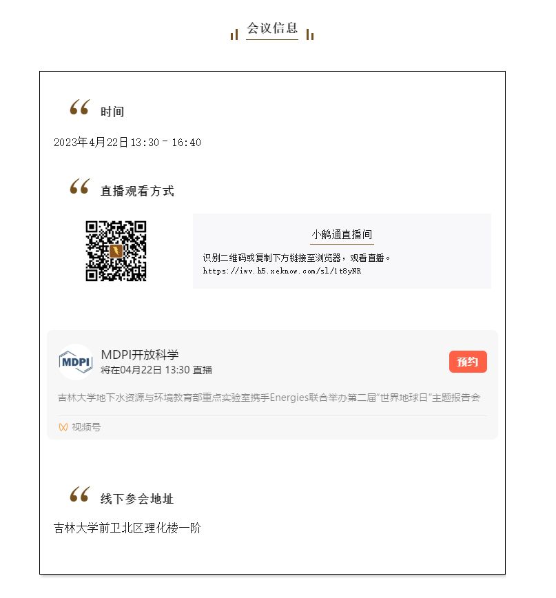 今年是吉林大学地学学科创建的第70周年,为庆祝此学科的长足发展并响应“世界地球日”的号召,吉林大学地下水资源与环境教育部重点实验室携手 Energies 期刊联合举办“世界地球日”主题报告会,就应对全球气候变化——“地质碳中和与地下新能源”相关领域的最新研究成果与应用进展为大家带来精彩的学术报告。本次研讨会开播时间为2023年4月22日13:30–16:40,欢迎大家积极参与!