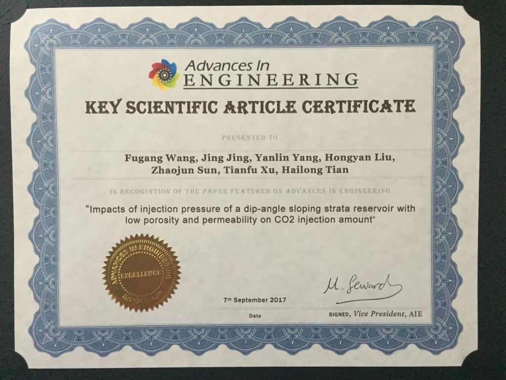 近期六合彩即时开奖 王福刚老师的论文“Impacts of injection pressure of a dip-angle sloping strata reservoir with low porosity and permeability on CO2 injection amount”被加拿大Advances in EngineeringAIE组织选为工程进展领域有创新性的重要科学论文,并予以特别报道(证书附后)。