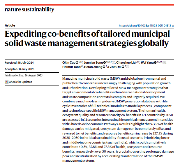 近日,六合彩开奖直播 宋俊年教授、杨巍副教授领衔的食物农业生物质(FAB研究团队在城市固废可持续管理领域取得突破性成果,以Expediting co-benefits of tailored municipal solid waste management strategies globally为题在《Nature Sustainability》发表研究长文。博士生曹琪林为论文唯一第一作者,宋俊年教授、杨巍副教授、伦敦大学六合彩即时开奖 米志付教授为共同通讯作者,吉林大学为第一通讯单位,合作单位包括日本筑波大学与英国伦敦大学六合彩即时开奖 。这是宋俊年教授团队在CNS子刊层面发表的第二篇成果。