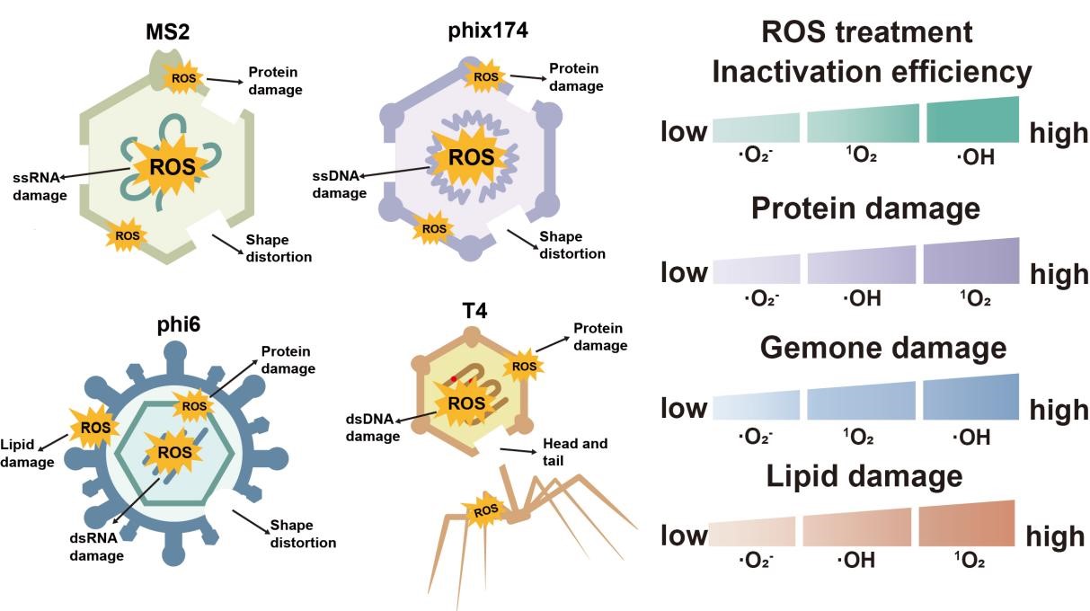 研究选取四种典型结构的噬菌体(MS2、phi6、phix174和T4)作为指示病毒,四种病毒在光催化体系中的灭活抗性依次为 T4 > phix174 > MS2 > phi6。结合病毒灭活动力学,计算得出四种病毒被羟基自由基(·OH)、单线态氧(1O2)和超氧阴离子(·O2−)灭活的二级速率常数分别在109~1010、107~108和~105 M-1 s-1范围。四种病毒对活性氧物种的敏感性呈现显著差异,敏感性顺序为:φ6 > MS2 > φix174 > T4。病毒衣壳的组成、形态与稳定性均影响其对ROS的敏感性,蛋白结构越复杂,抗性越强;RNA病毒较DNA病毒更易受损,单链基因组更脆弱,敏感性顺序依次为 ssRNA > dsRNA > ssDNA > dsDNA。包膜病毒因脂质富含不饱和脂肪酸,易发生ROS诱导的过氧化,故而更易失活。此外,不同ROS的氧化能力影响其对病毒组分的破坏效率。·OH主要攻击基因组,可广谱性破坏RNA与DNA病毒;·O2−可有效降解RNA病毒基因组,但对DNA病毒影响较弱;1O2对病毒蛋白的反应性远高于基因组,能实现对病毒蛋白的精准高效破坏。此外,不同ROS在实际水体中灭活不同结构病毒的抗环境干扰能力存在显著差异(1O2 > ·O2- > ·OH),与·OH 和·O2-相比,1O2具有寿命长、pH耐受性宽、抗环境介质干扰能力强等优点,更适合实际水环境中的病毒消毒。本研究通过探索病毒灭活的动力学和生物学机制,深化了对于结构不同的病毒对不同ROS敏感性差异机制的理解。