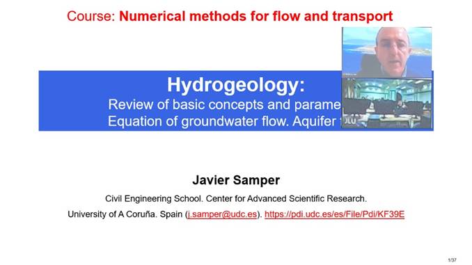 在地下水资源规模化开发和利用的过程中,为了实现经济、可持续的开采,通常需要借助数值模拟手段对长期开采条件下的储层特征演化及潜在风险(水资源枯竭、海水入侵、地面沉降);人类活动对地下水的污染等方面进行系统地评价和分析。Javier Samper 教授在讲座中首先带同学们从整体上了解地下水数值模拟的基本流程,并且结合自身多年工作经验和对专业的理解,强调建立合理、正确的水文地质概念模型在整个模拟工作中的重要地位。在之后的讲座中,Javier Samper 教授从水文地质基本概念入手,由浅入深,带领同学们梳理回顾了在地下水数值模拟中常用的水文地质参数及其含义及常见的数值模拟求解方法(有限元法,有限差分法等)。在讲座中Javier Samper 教授喜欢用自己野外踏勘中的照片结合素描画的形式去阐述水文地质现象,一方面生动形象地加深同学们对专业的认知和理解;另一方面也能够积极调动同学们的学习热情。