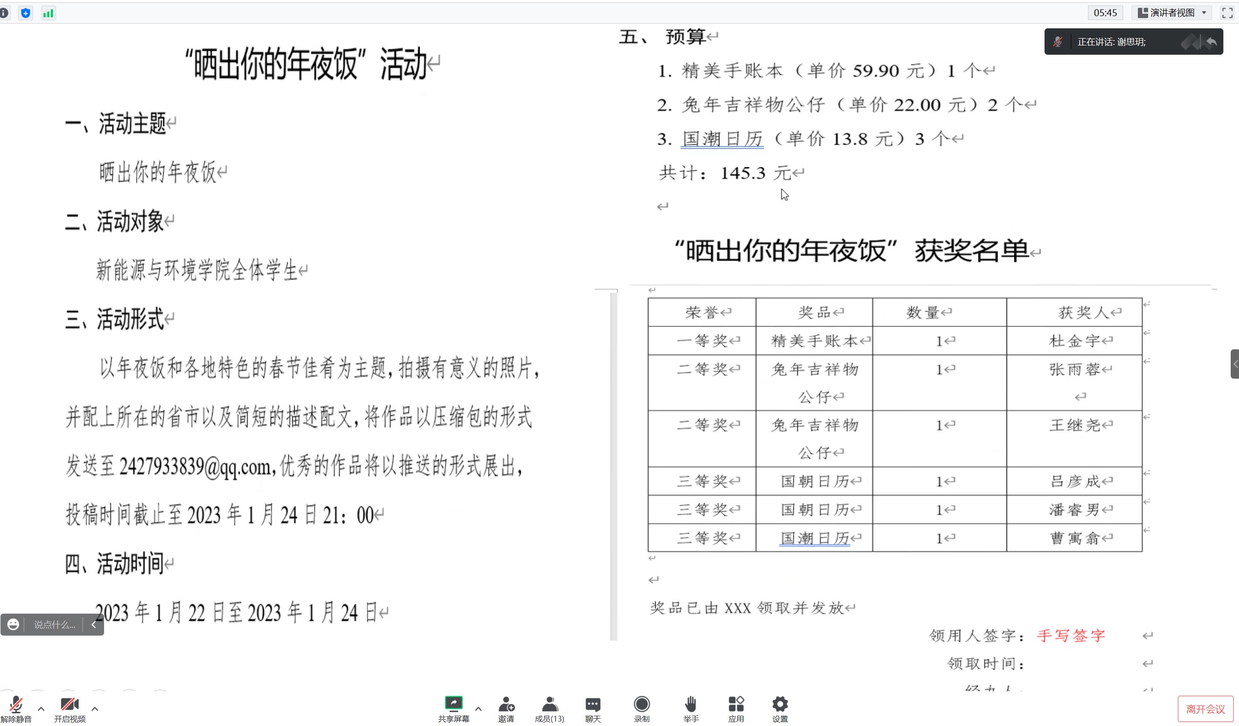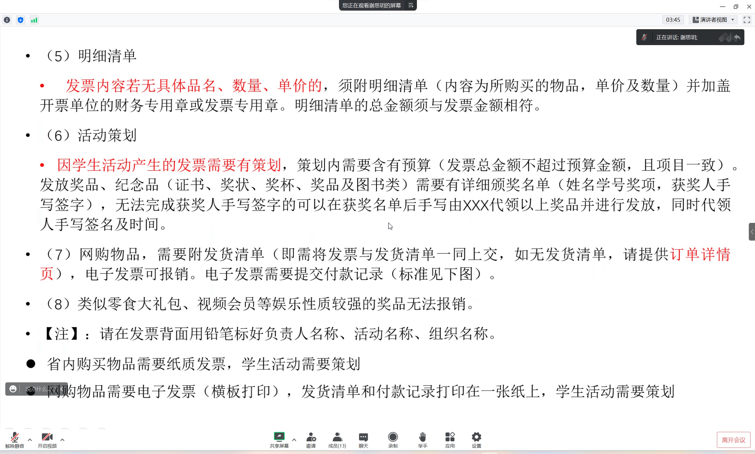 会上,谢思玥详细讲解了策划撰写的主要内容,强调了学生活动经费审批使用的流程,与会同学共同明确干事的职责划分。倡导学团组织干事要及时做好沟通交流,协商互相帮助完成工作,活动策划人或负责人要对活动执行负责到底。