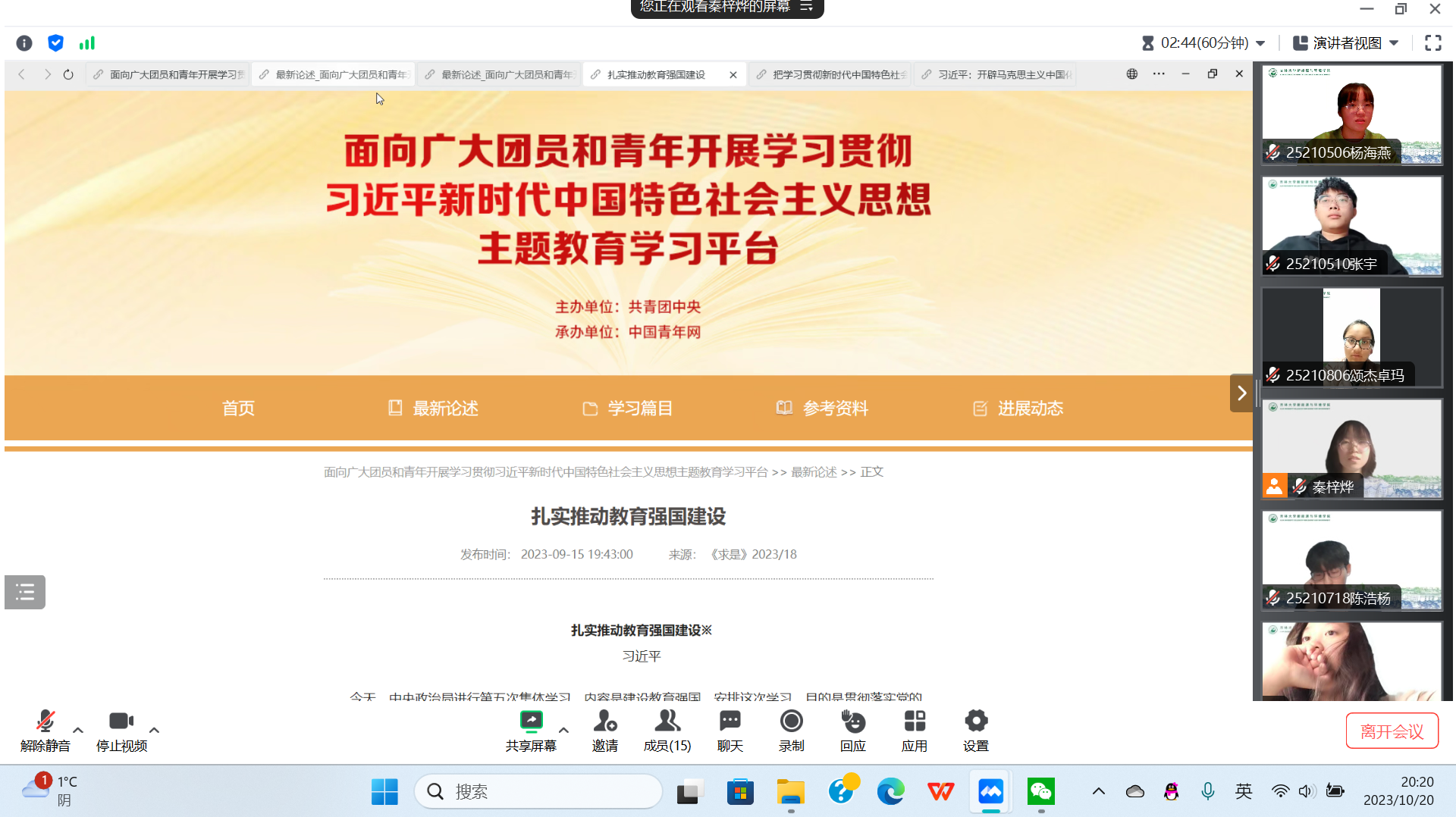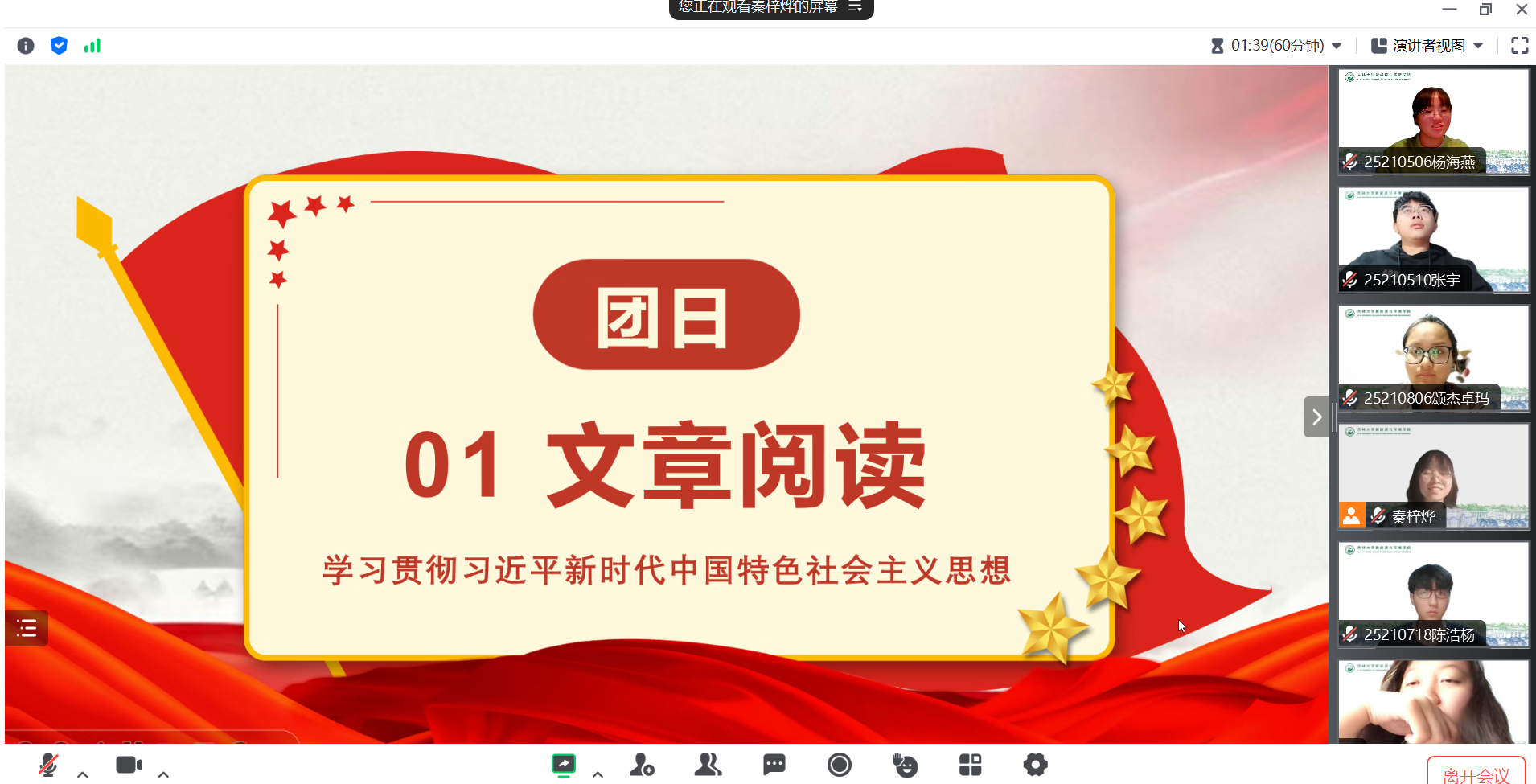 虽然线上会议时间有限,同学们不能一同阅读更多文章,但思想上的启迪会激励同学们不断学习进步。道阻且长,行则将至。相信在会议结束后的日常活动中,支部也将定期分享时事政治内容到班级群并鼓励同学们自行阅读,交流感悟;相信本次团日活动结束后,同学们也会继续保持对党和国家的热爱,自觉学习贯彻习近平新时代中国特色社会主义思想,以青春之光点亮未来,以理想之力共写新篇,为党和国家的建设事业踔厉奋发,勇毅前行!