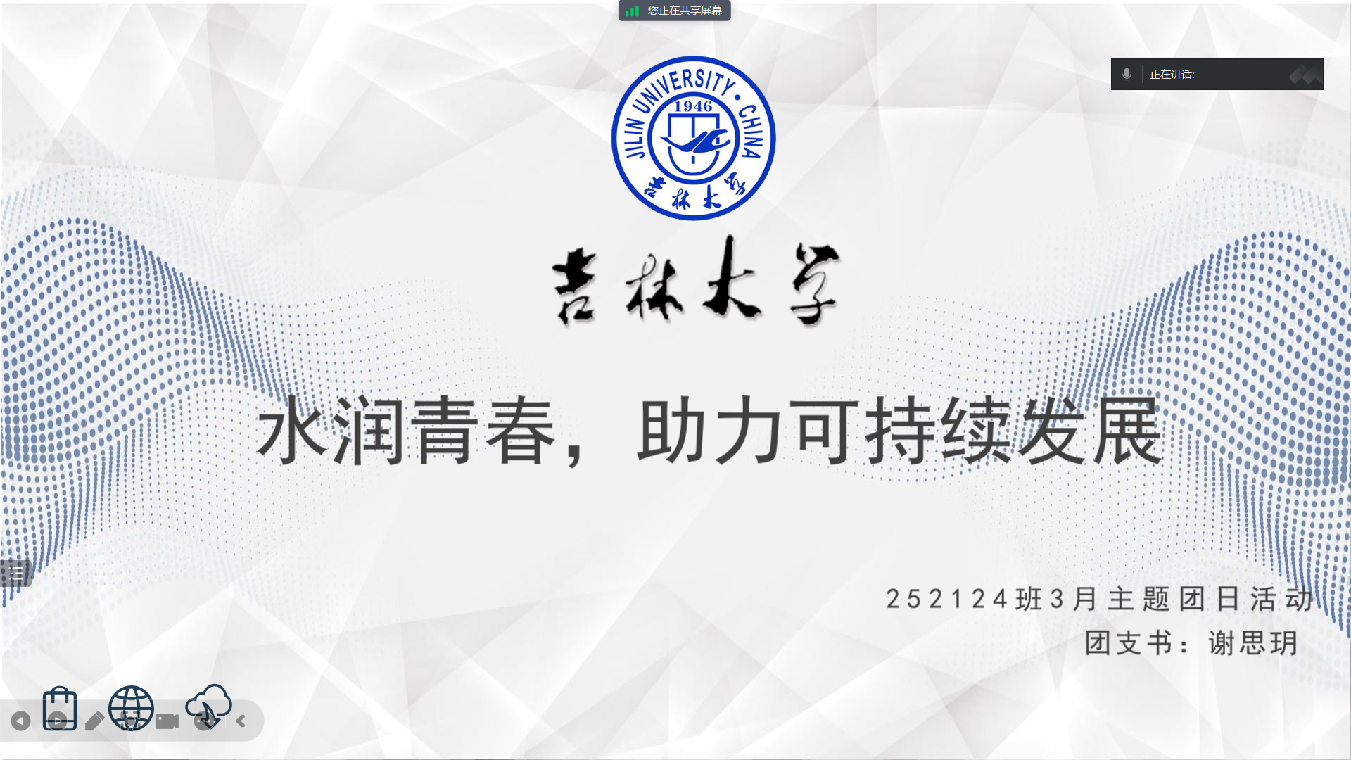 252124班在团支书谢思玥的带领下,召开了以“《水润青春,助力可持续发展》”为主题的团日活动,届时四班全体同学参加了本次活动。