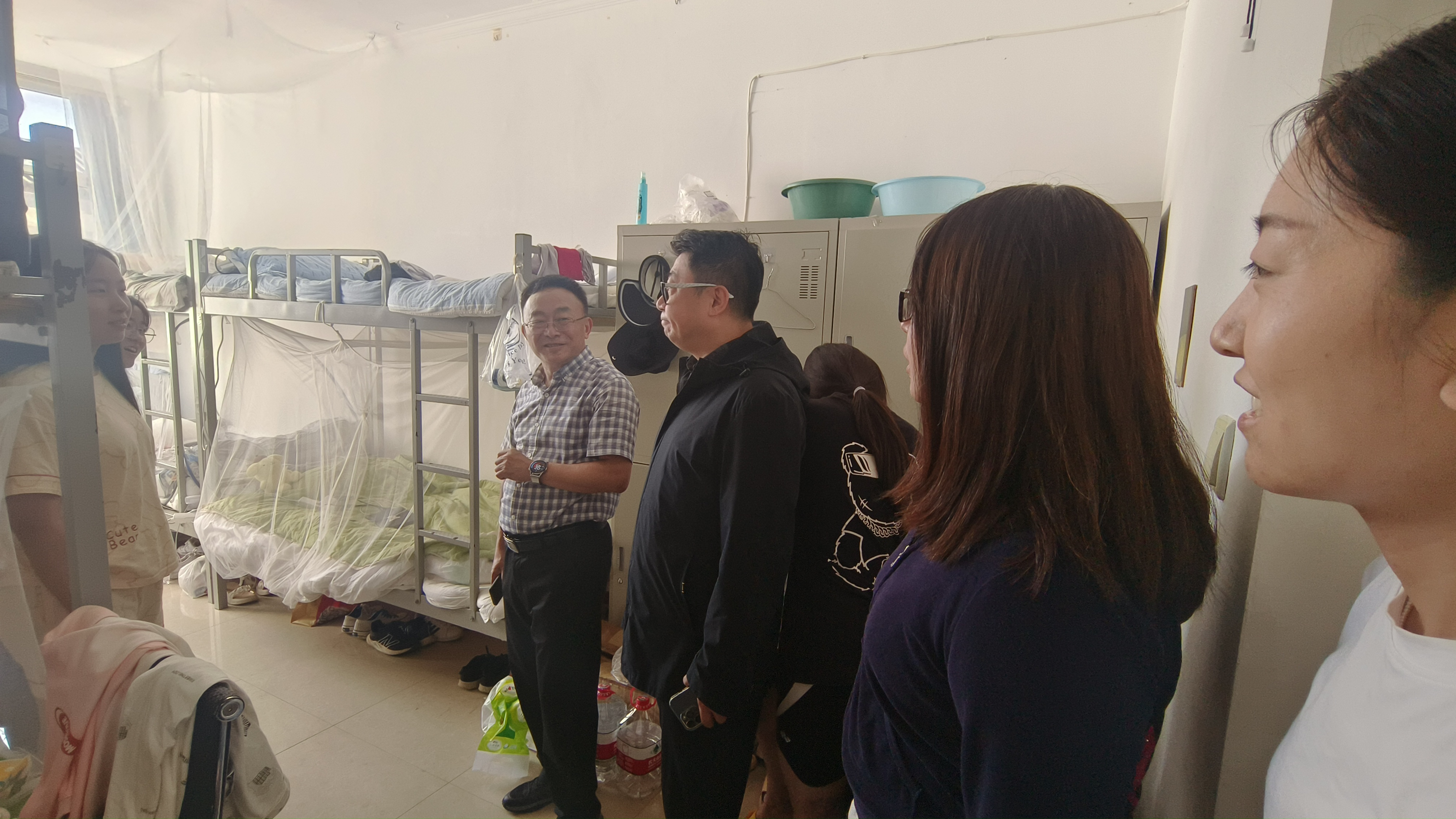 关心慰问,了解本年度实习计划与进展,询问教学实习困难并加以解决。随后,党委书记汪祥松、副书记吴哲、教学办公室主任刘南、2021级辅导员李薇共同前往学生公寓走访,实地了解实习学生学习生活情况。“食堂伙食怎么样?野外实习还能够适应吗?”走访中汪书记多次询问大家的生活情况。同学们纷纷表示食堂的伙食不错红烧肉特别好吃,基地环境很好,凉亭走廊很舒适。刚来到兴城的时候天气还比较炎热,大家在寝室通过开窗开风扇的方式克服,现在天气凉爽寝室已经不需要开风扇了。在适应了实习基地的生活后,野外实习更加顺利,大家对专业能力的提升充满信心。汪书记在了解后,表扬了寝室的卫生状况,肯定了同学们吃苦耐劳、脚踏实地的地学精神,鼓励大家珍惜实习机会,进一步提升个人能力,圆满完成本次的实习任务。