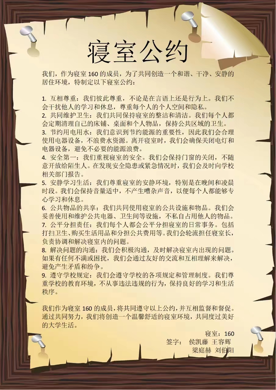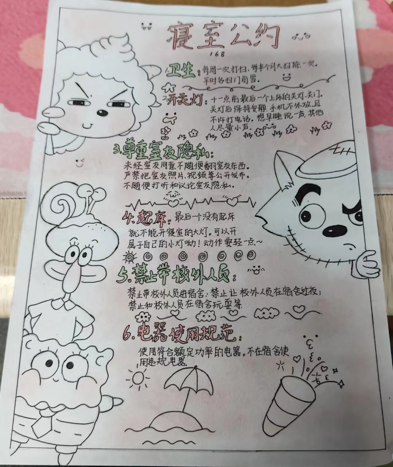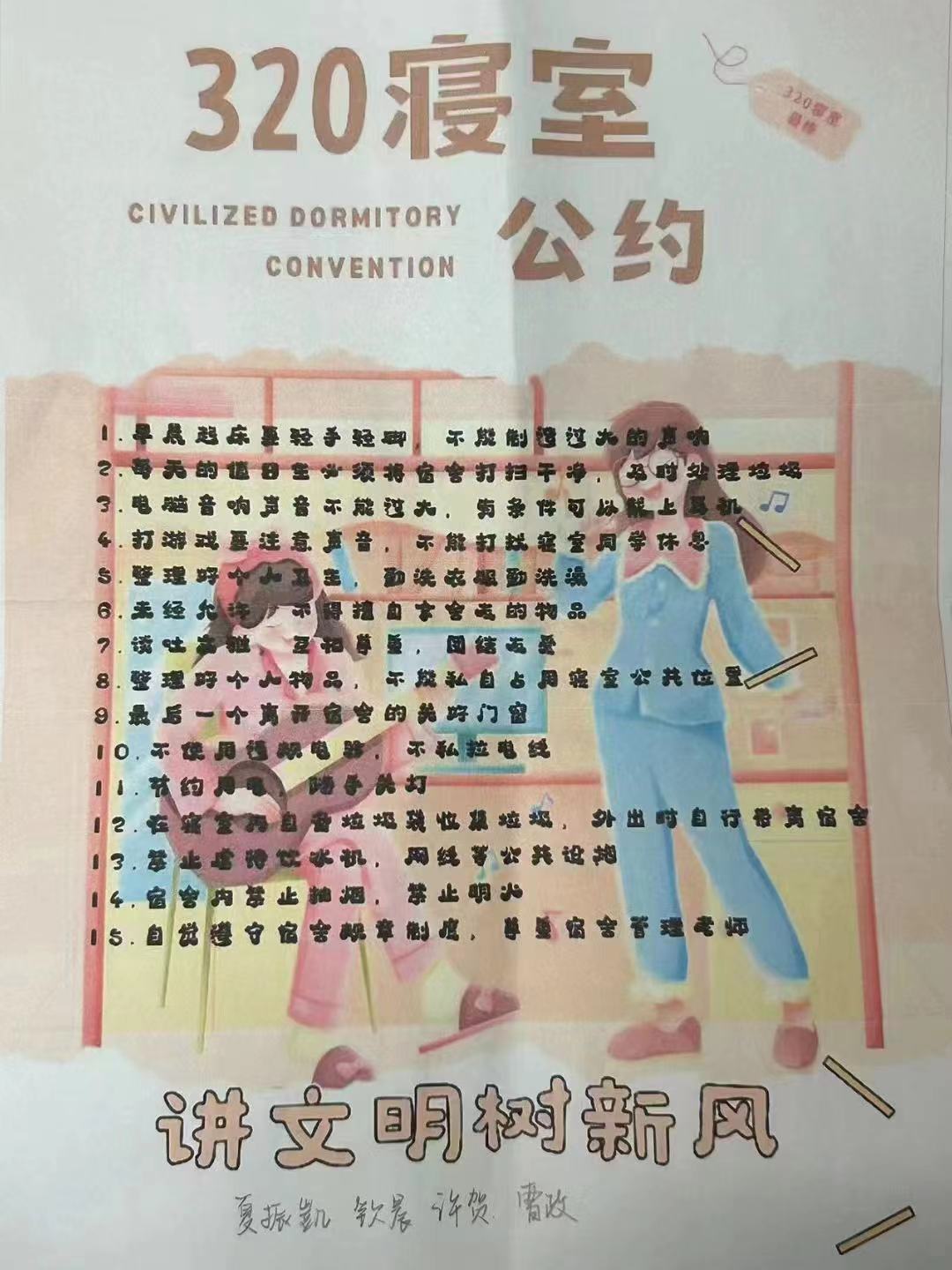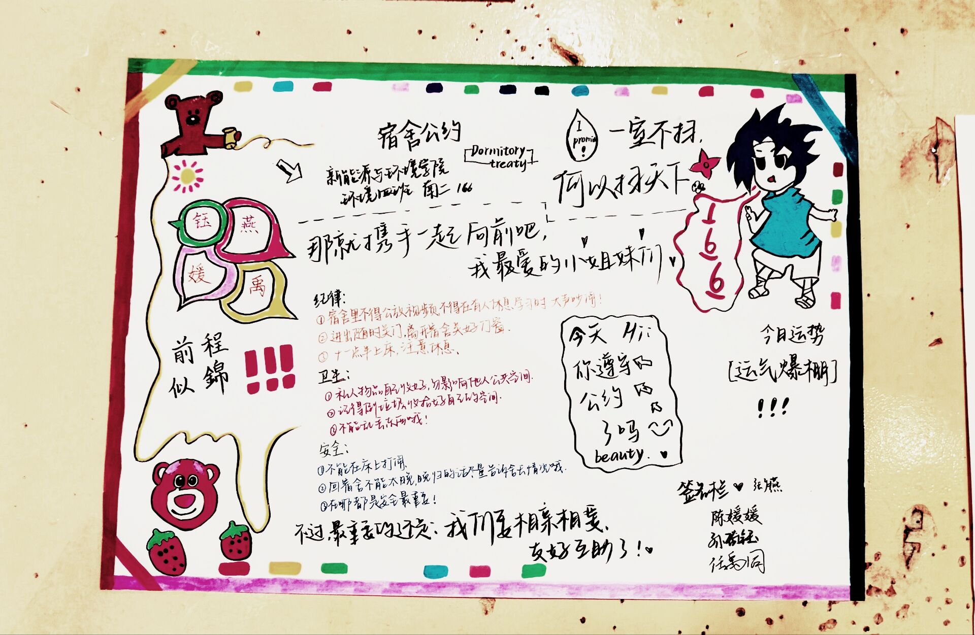 为进一步加强公寓文化建设,发挥公寓育人阵地作用,推动学生寝室制度化、有序化管理,引导学生养成良好的生活习惯,营造文明和谐、干净整洁的寝室文化氛围,新能源与环境六合彩即时开奖 面向全体2023级本科生举办寝室公约创建活动,以多种多样的形式围绕宿舍卫生、校规校纪、学习氛围、作息时间等方面进行设计,涌现出一大批优秀的寝室公约。(以下排名不分先后)