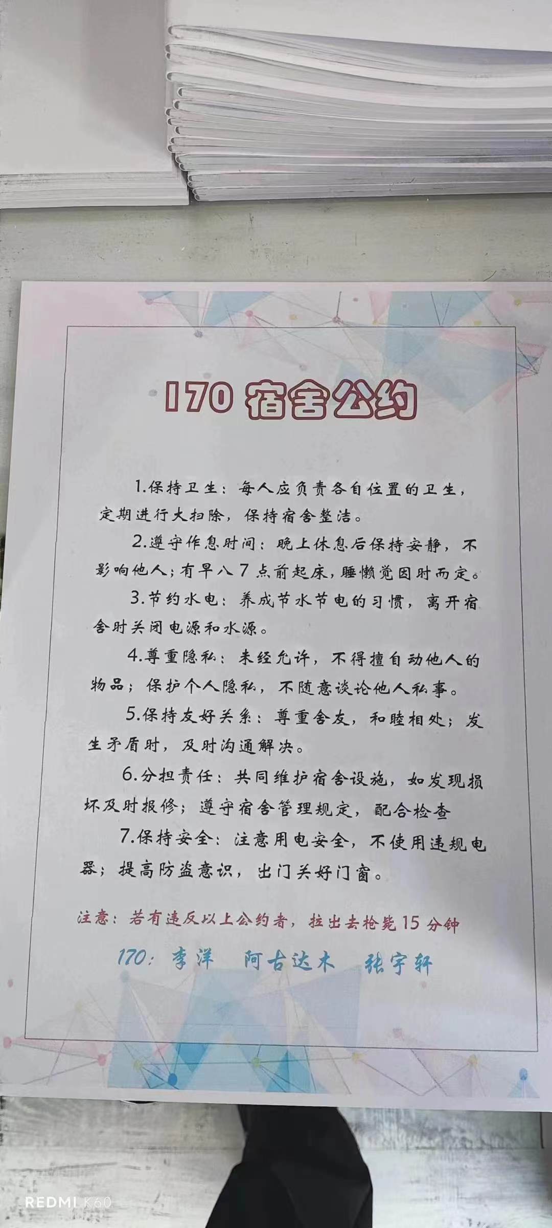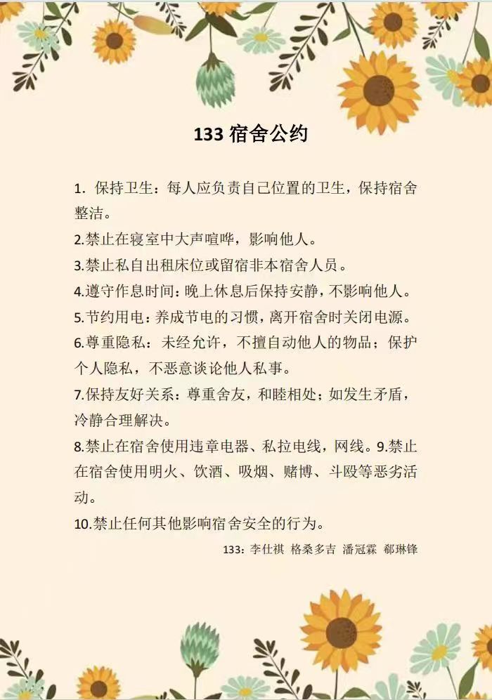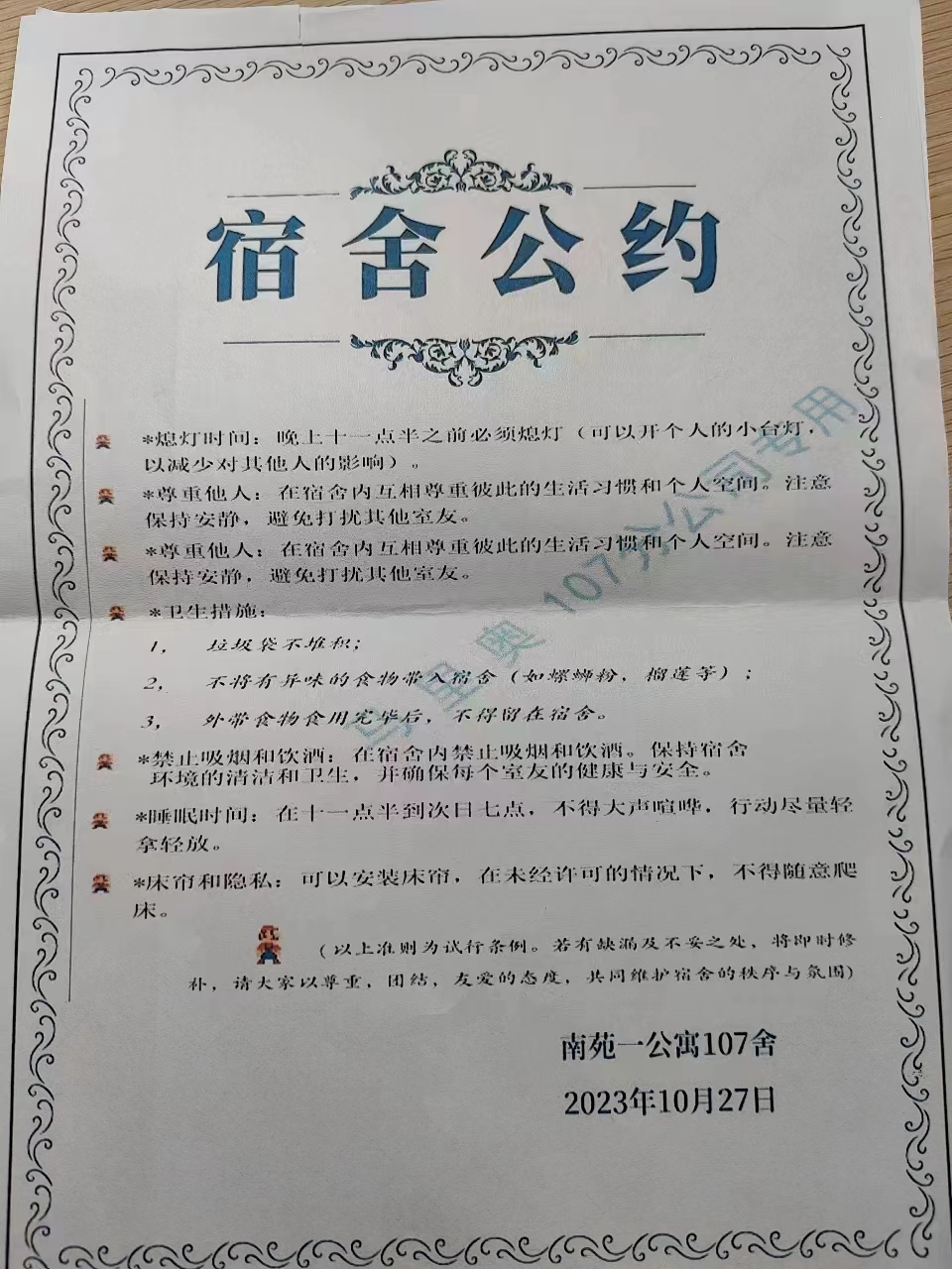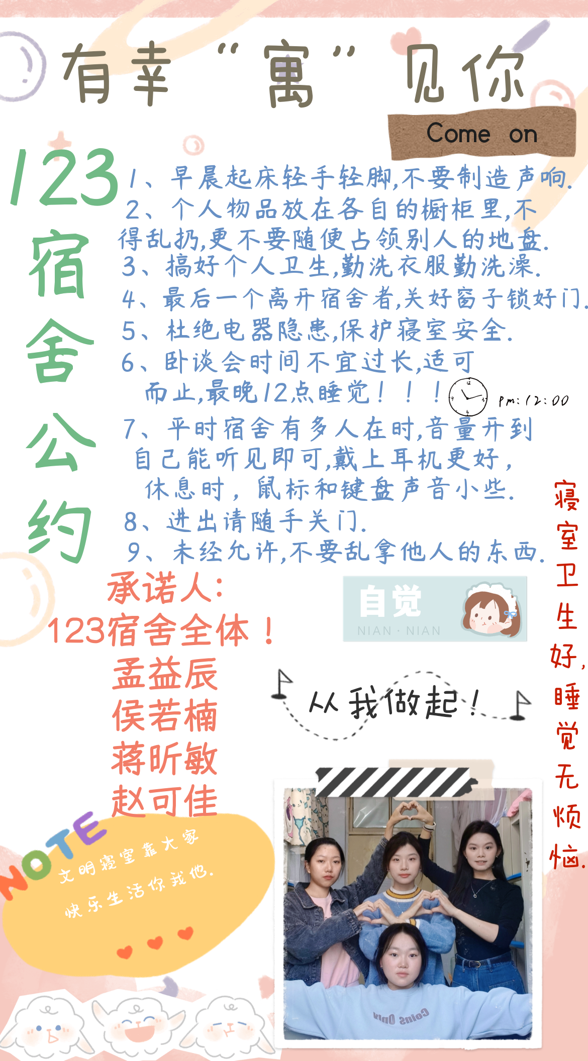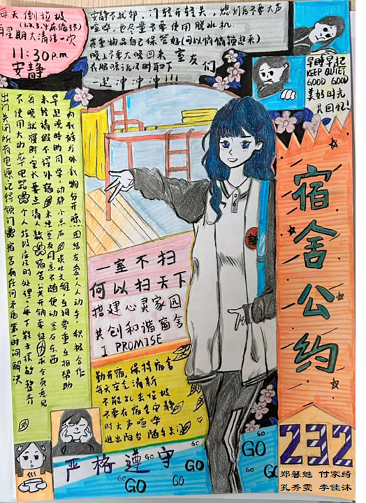 为进一步加强公寓文化建设,发挥公寓育人阵地作用,推动学生寝室制度化、有序化管理,引导学生养成良好的生活习惯,营造文明和谐、干净整洁的寝室文化氛围,新能源与环境六合彩即时开奖 面向全体2023级本科生举办寝室公约创建活动,以多种多样的形式围绕宿舍卫生、校规校纪、学习氛围、作息时间等方面进行设计,涌现出一大批优秀的寝室公约。(以下排名不分先后)