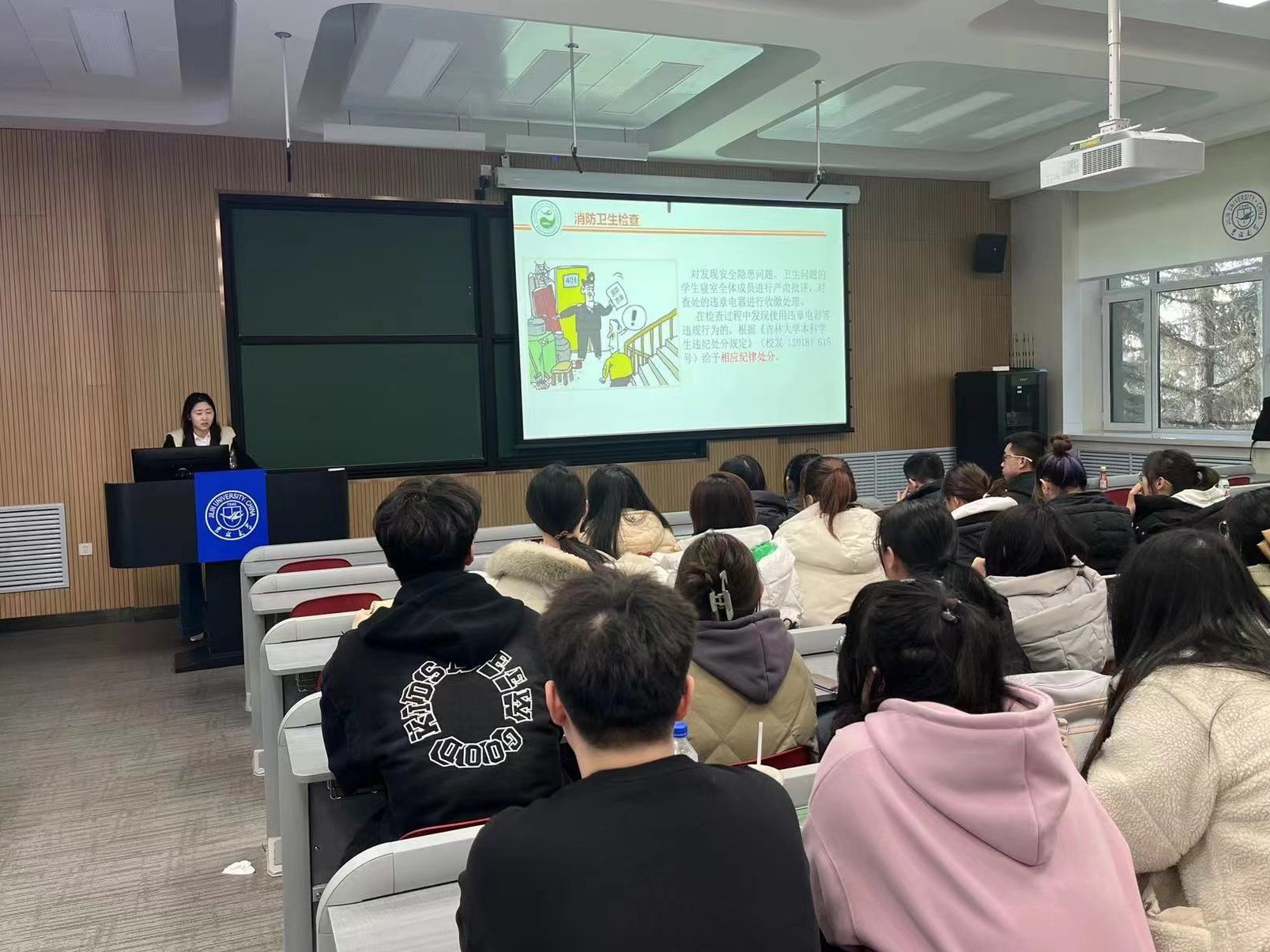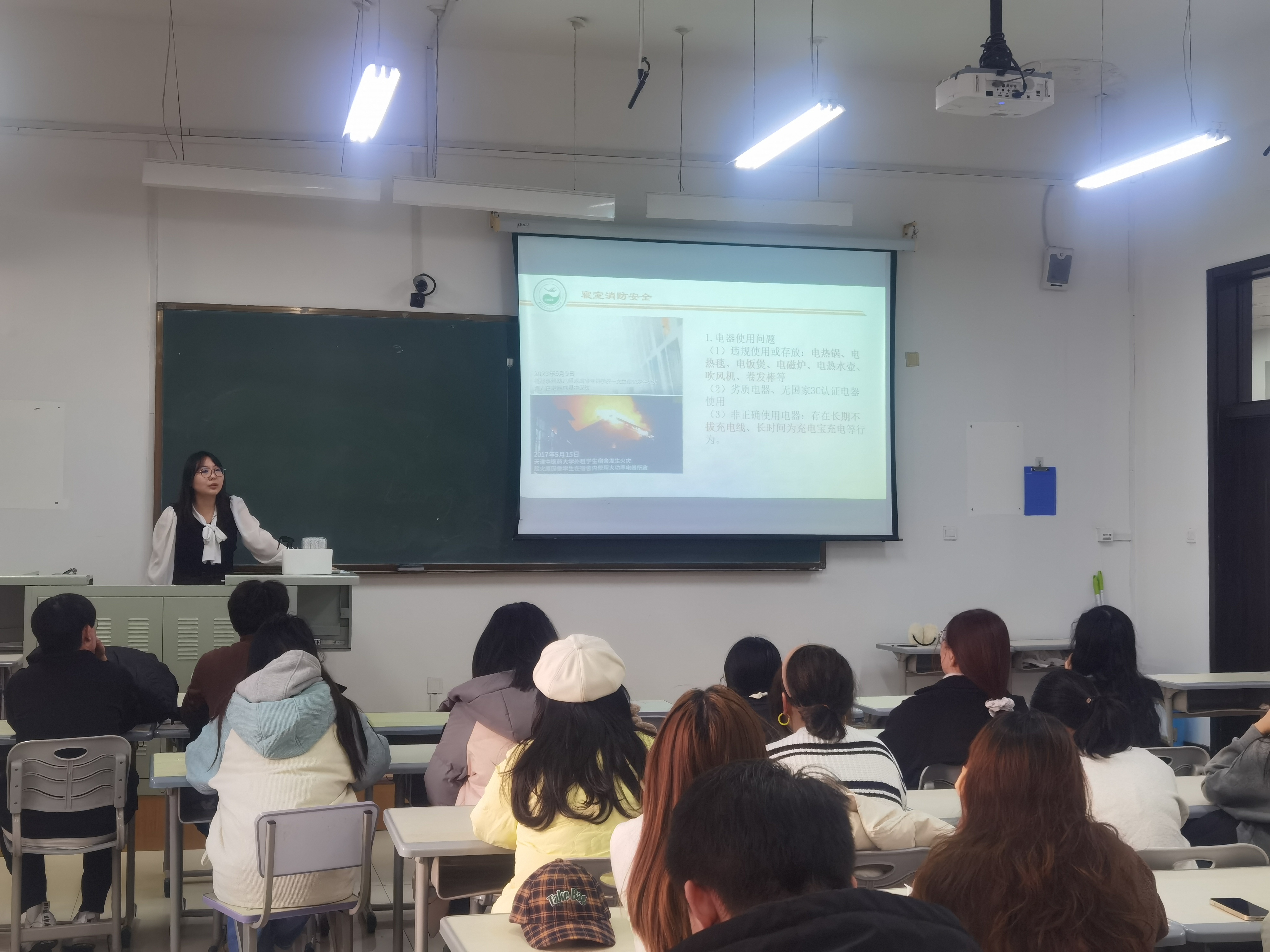 一是消防安全教育。近来,校园消防安全事故频发,给全体师生敲醒警钟。各位老师首先就寝室消防安全问题再次做出强调,对注意电器使用、电动车的使用、明火使用、物品存放、离寝断电等消防安全隐患进行详细解答,提醒同学们关注人身安全,科学防患未“燃”。同时严肃纪律,对寝室安全检查中出现安全隐患问题、卫生问题的学生宿舍进行严肃批评,警示如若在寝室检查过程中发现使用违章电器等违规行为,将缴违规电器并给予相应的纪律处分。