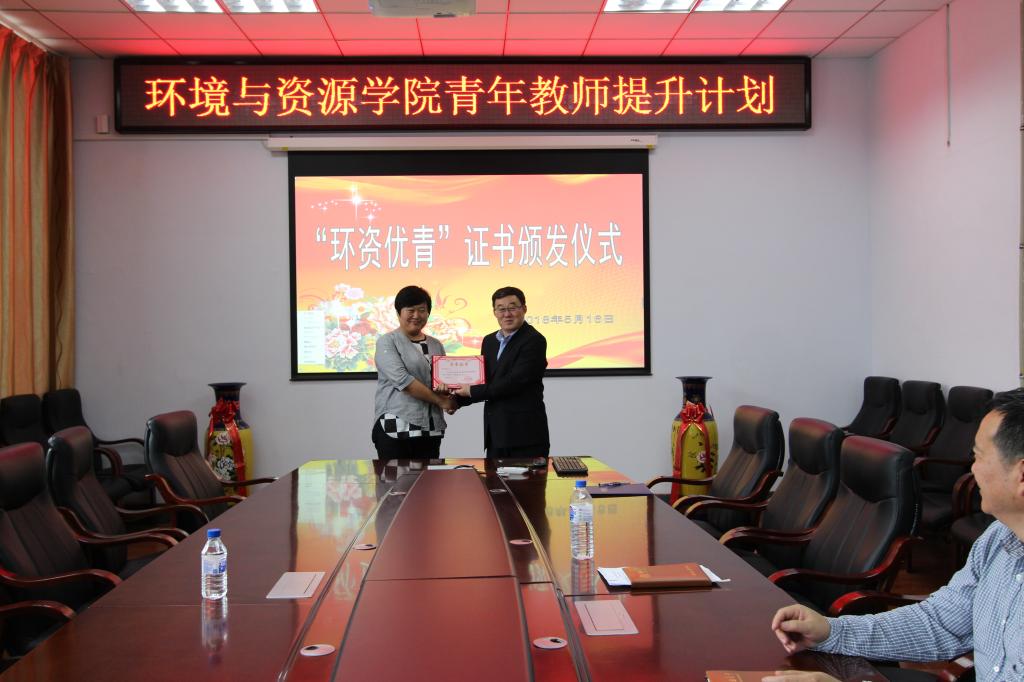 青年教师提升计划,被评选为“环资优青”荣誉称号的8位青年教师迟子芳、宋俊年、田涛、周睿、姜振蛟、吕聪、段海燕、郭志勇颁发了荣誉证书。