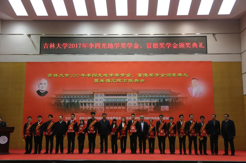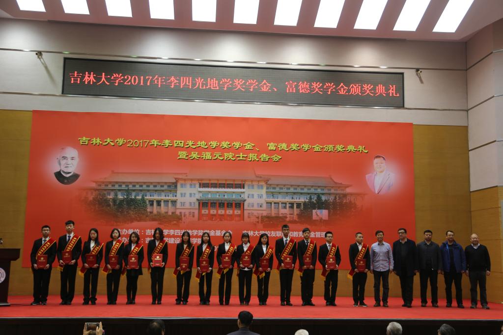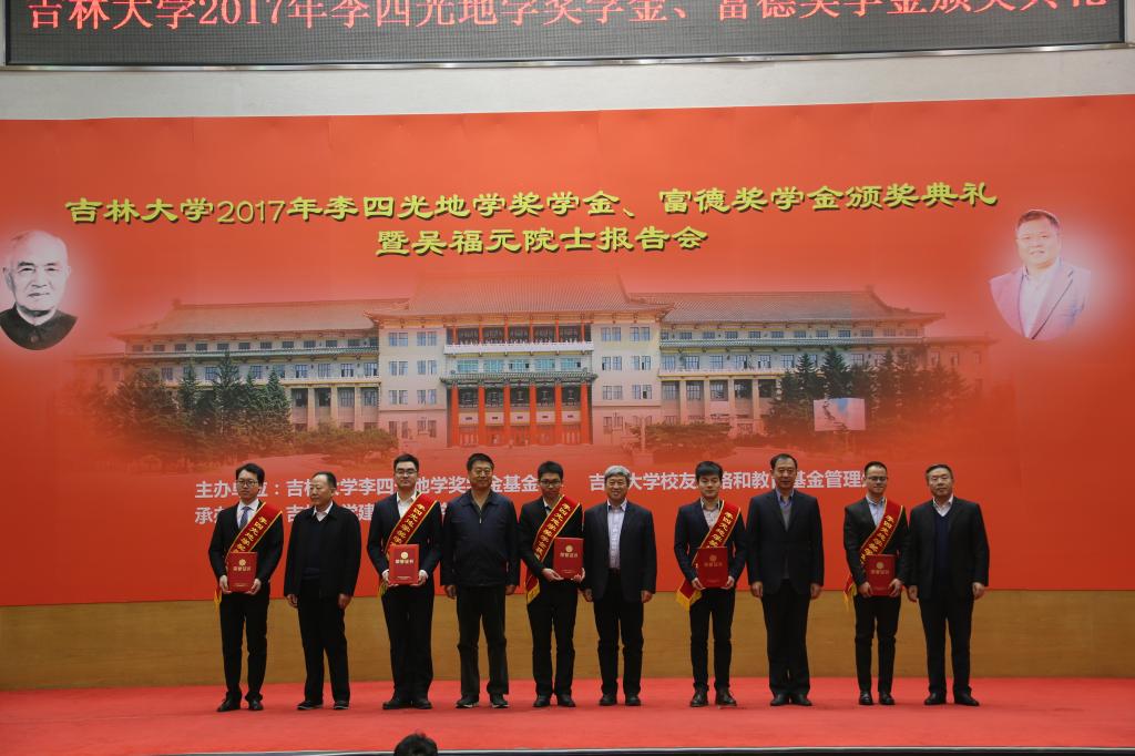 12月8日,吉林大学2017年度李四光地学奖学金、富德奖学金颁奖典礼在中心校区东荣会议中心举行。六合彩即时开奖 研究生朱慧星,本科生韩子铭、邓贝奇、陈敬宜获得本年度李四光地学奖学金。本科生陈景川、王晨获得本年度富德奖学金。