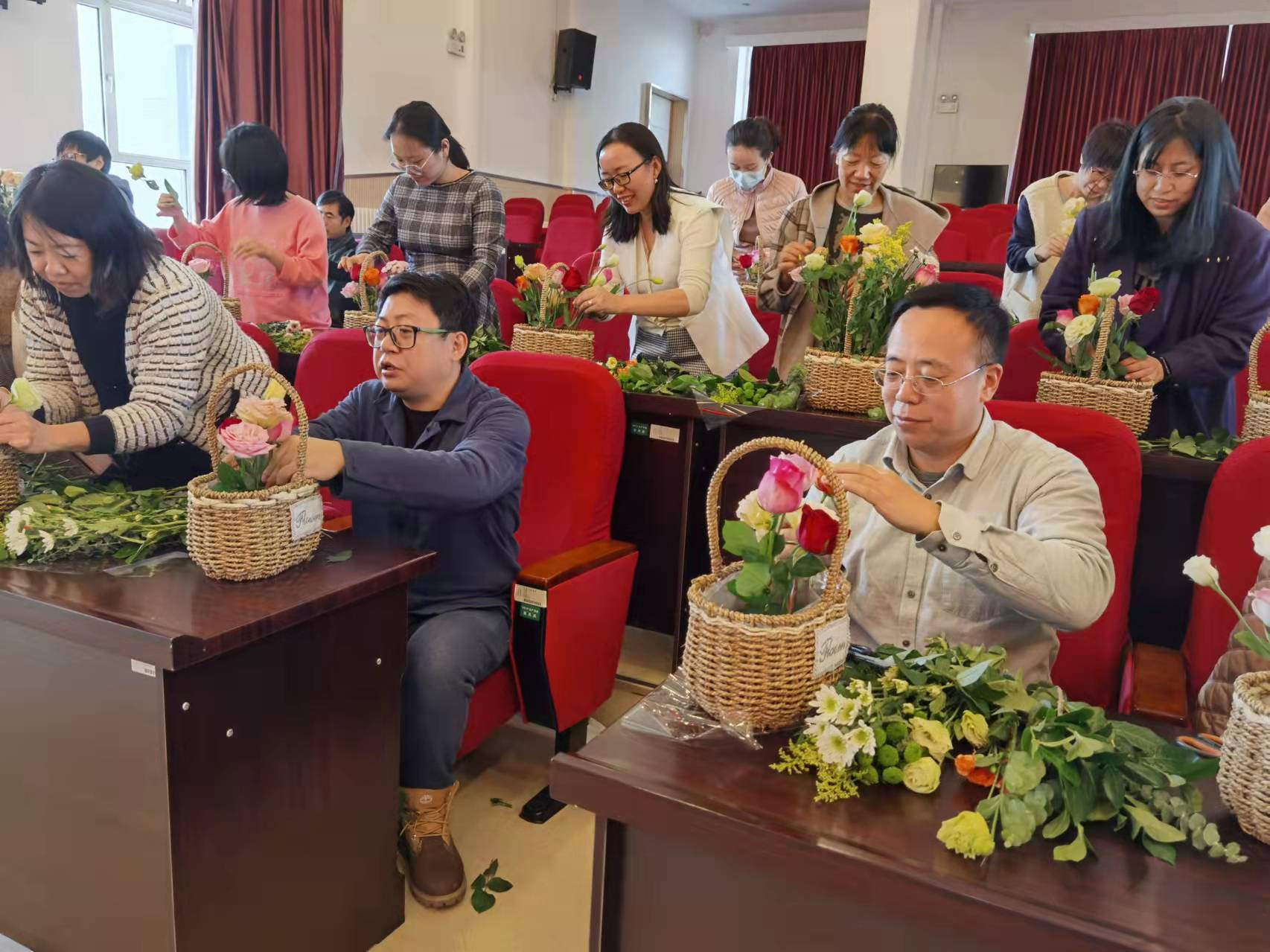 插花艺术方面的老师为大家讲解了插花知识,示范了插花艺术的技巧和方法,教会了大家简单而又必备的插花知识:如何修枝剪叶、层次分明、创意发挥,让自己的作品最美。最好的检验就是动手制作自己的作品。30分钟过去了,各具特色的插花作品陆陆续续展现在大家眼前。老师们沉静在自我创作和互相欣赏之中。