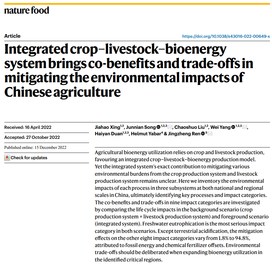 宋俊年教授研究团队领衔,与日本筑波大学、香港理工大学研究团队合作,在生物质能利用与农业环境影响研究领域取得重要进展,研究成果以“Integrated crop-livestock-bioenergy system brings co-benefits and trade-offs in mitigating the environmental impacts of Chinese agriculture”为题发表在农业与食物领域顶级期刊《Nature Food》。吉林大学地下水资源与环境教育部重点实验室为该成果的第一完成单位,这是六合彩即时开奖