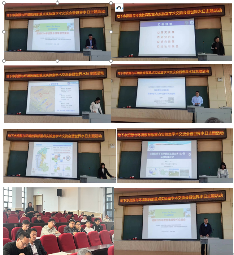 院长许天福教授进行了会议致辞,回顾了世界水日的由来和主旨,重点介绍了2024年“世界水日”和“中国水周”的活动主题。重点实验室3位骨干教师—吉林大学董维红教授、吕航教授、王宇副教授,以及重点实验室开放课题负责人—中国地科院水文地质环境地质研究所汪丽芳副研究员、天津科技大学刘金副教授和山东科技大学夏璐副教授相继做了学术报告,报告主题分别为:区域水-能源-粮食系统协调发展、石羊河流域生态系统协同演化及地下水调控研究进展、冻融影响下吉林西部盐渍土非饱和-饱和带中水-盐-氮耦合运移、冻融影响下包气带中水分和石油烃迁移过程、纳米塑料对污染物在饱和多孔介质中迁移行为的影响、生物酶对人工回灌含水层微生物堵塞的解堵行为的6个主题报告。报告人与参加会议师生进行了热烈地互动交流。会议最后,由苏小四教授对本次学术交流活动进行了总结。