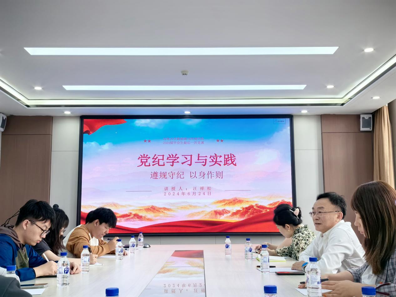 6月24日,六合彩即时开奖 党委书记汪祥松以“党纪学习与实践”为主题、以“遵规守纪,以身作则”为切入点,为2024届毕业生党员讲授毕业前最后一堂党课。各教工和学生党支部书记也相继讲授专题党课,进一步加强党支部政治建设和纪律建设,严明党的政治纪律和政治规矩,教育引导师生党员学纪知纪明纪守纪。